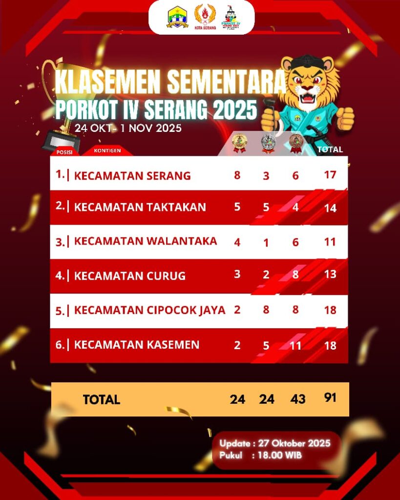 HUMAS – Kontingen Kecamatan Serang untuk sementara berhasil memimpin perolehan medali di hari ketiga pelaksanaan Pekan Olahraga Kota atau Porkot IV Serang Tahun 2025, Senin 27 Oktober 2025.